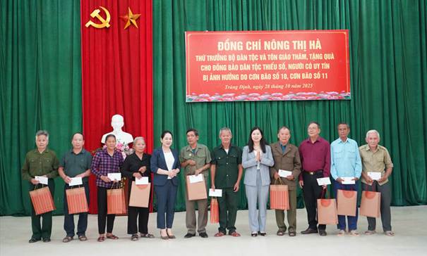 Nhằm kịp thời chia sẻ khó khăn với đồng bào dân tộc thiểu số bị ảnh hưởng bởi cơn bão số 10 và số 11 vừa qua, ngày 28/10/2025, Đoàn công tác của Bộ Dân tộc và Tôn giáo do đồng chí Nông Thị Hà, Thứ trưởng Bộ Dân tộc và Tôn giáo làm Trưởng đoàn đã đến thăm, tặng quà người có uy tín và các hộ đồng bào dân tộc thiểu số tại các xã: Thất Khê, Tràng Định trên địa bàn tỉnh Lạng Sơn.