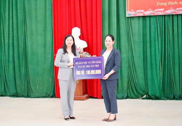 (Thay mặt Đoàn công tác, đ/c Nông Thị Hà, Thứ trưởng Bộ Dân tộc và Tôn giáo trao tặng cho tỉnh Lạng Sơn 100.000.000đ)
