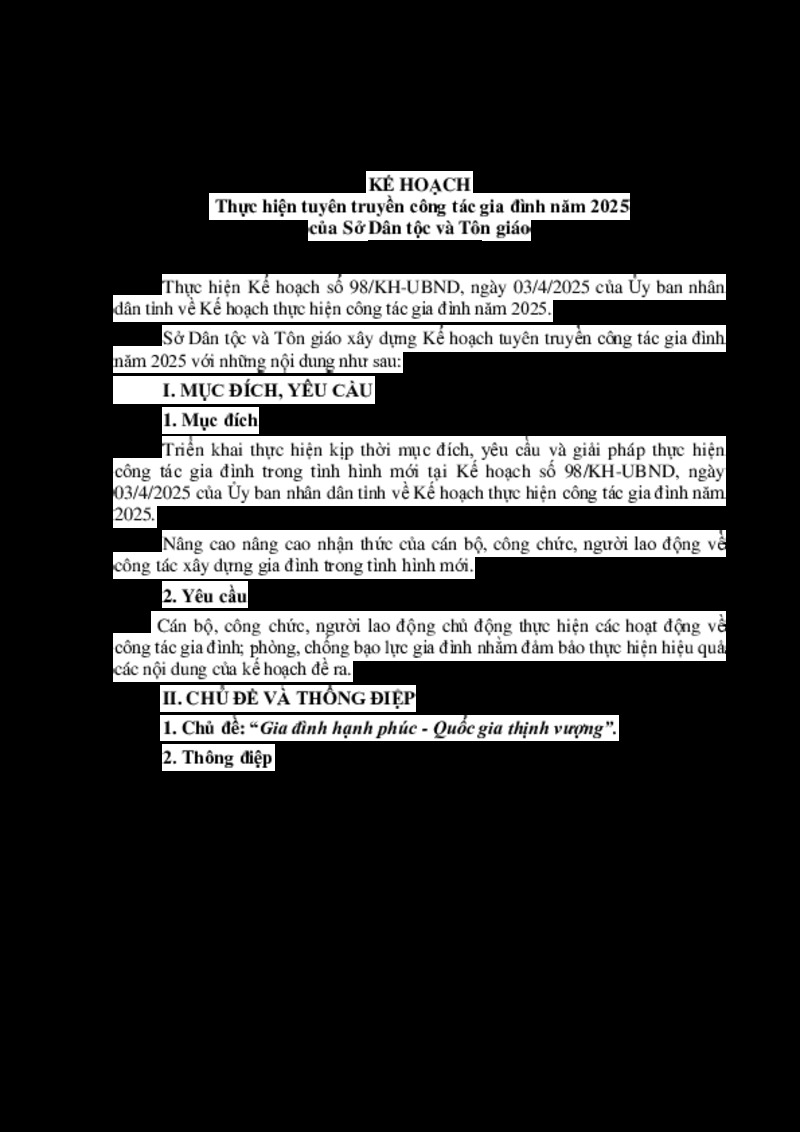 | Tiêu đề văn bản | Kế hoạch thực hiện tuyên truyền công tác gia đình năm 2025 của Sở Dân tộc và Tôn giáo | ||