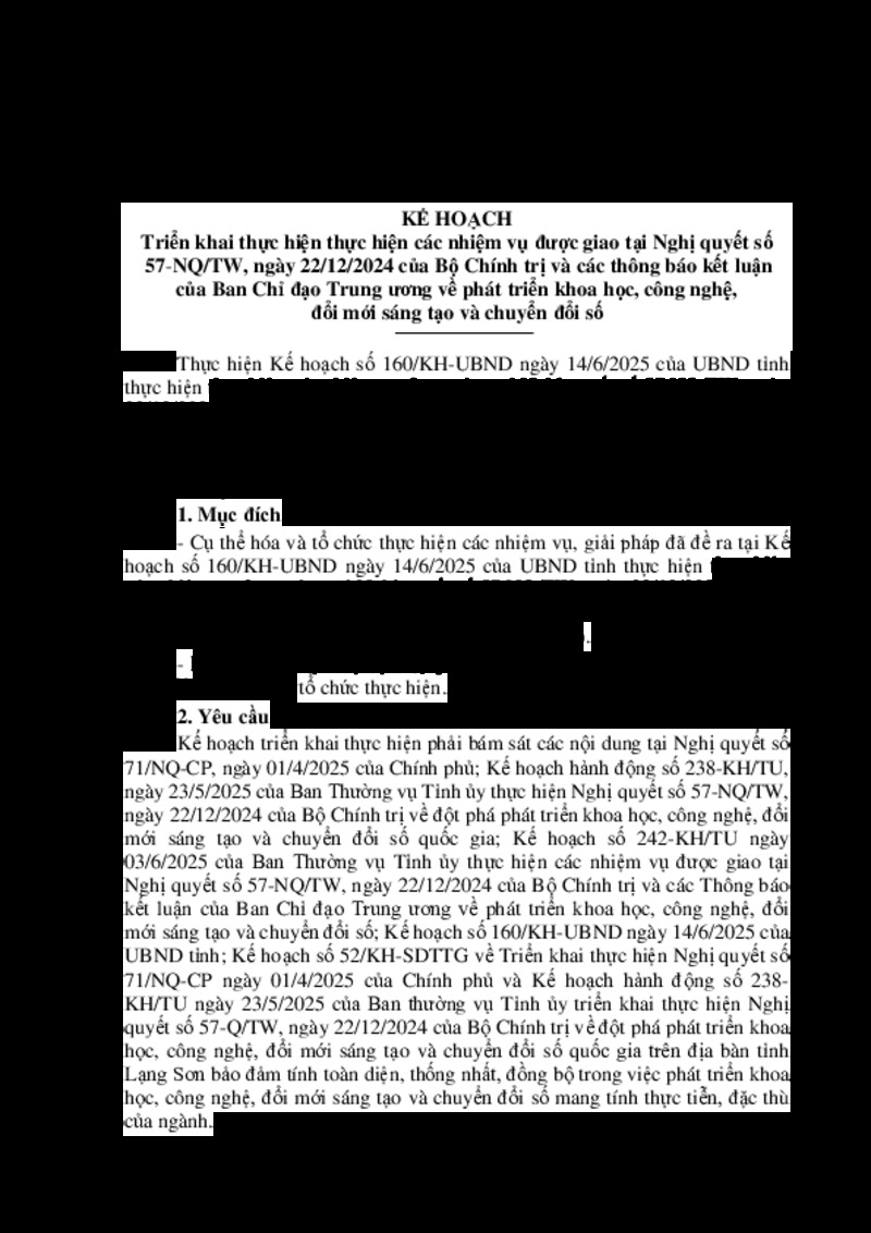 | Tiêu đề văn bản | Kế hoạch triển khai thực hiện thực hiện các nhiệm vụ được giao tại Nghị quyết số 57-NQ/TW, ngày 22/12/2024 của Bộ Chính trị và các Thông báo kết luận của Ban Chỉ đạo Trung ương về phát triển khoa học, công nghệ, đổi mới sáng tạo và chuyển đổi số | ||